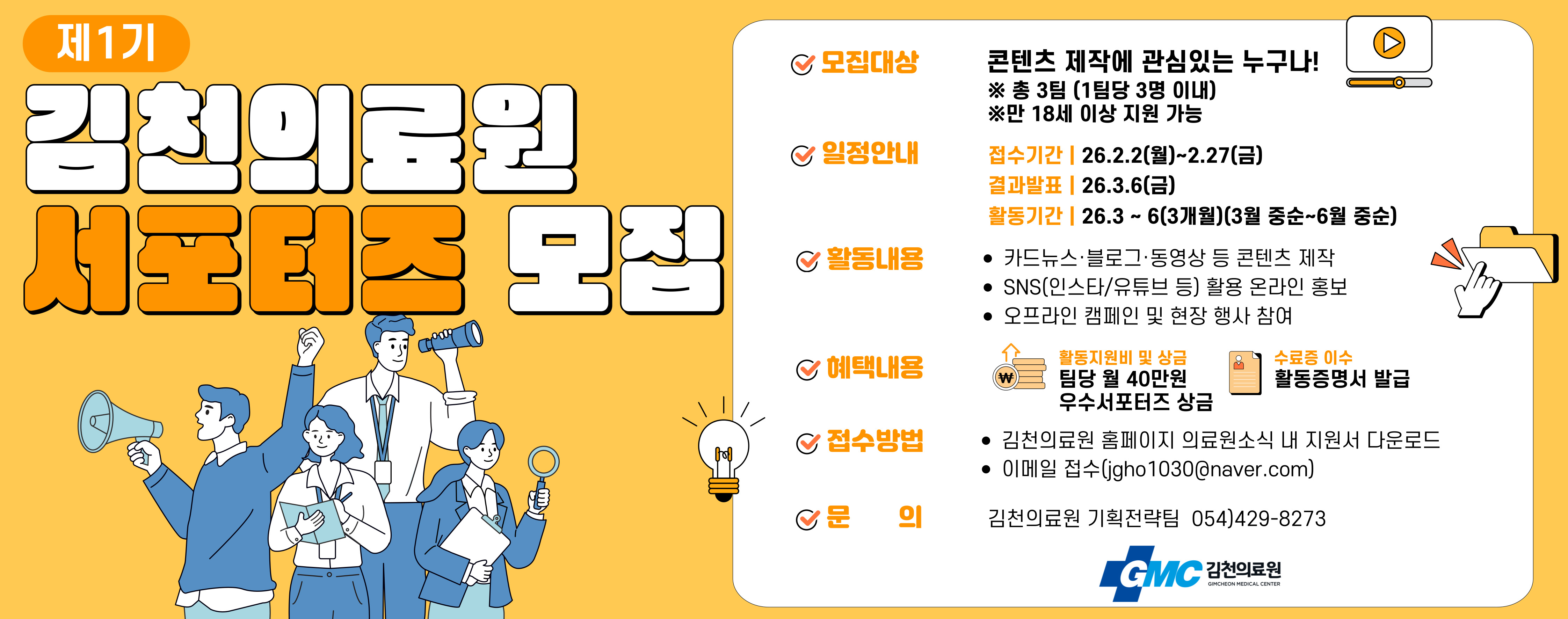 김천의료원의 소식과 다양한 공공의료 활동을 알릴 김천의료원 서포터즈를 모집합니다. 지역 대학생&...